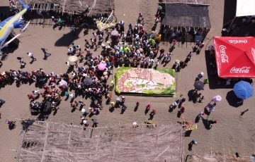 Luego de formar la figura de camarón más grande del mundo, fueron repartidos entre los turistas para su degustación.