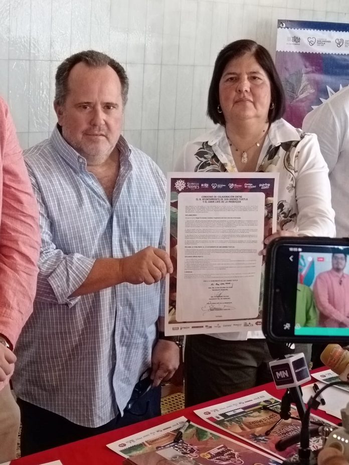La alcaldesa de San Andrés Tuxtla, María Elena Solana Calzada anunció este martes la quinta edición del festival internacional de globos de papel 2024 en el café de la parroquia de los 200 años, ubicado en la zona conurbada Veracruz- Boca del Río. En la conferencia de prensa, estuvo acompañada de sus hijos: el presidente del DIF Municipal, Felipe Rubio Solana; el presidente del Club de natación “Brujos” de San Andrés Tuxtla, el médico veterinario Ricardo Antonio Rubio Solana; así como el dueño del café de la parroquia de los 200 años, capitán Ángel Fernández Ceballos, a quien la alcaldesa agradeció las facilidades para la realización de la conferencia de prensa.