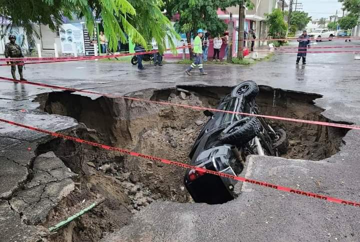 Camioneta cae en socavón en la calle Mariano Matamoros esquina J.M. Arrillaga de la colonia Pinos, en la zona norte del puerto de Veracruz.