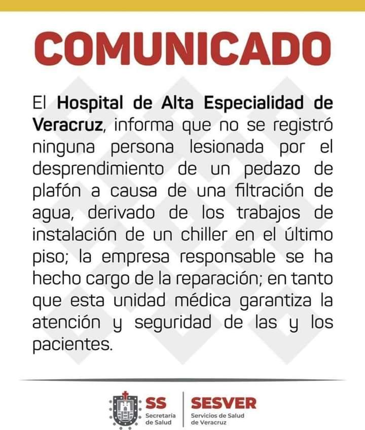 Veracruz, Ver., 21/10/24. Ninguna persona, ni paciente ni personal del Hospital de Alta Especialidad de Veracruz, resultó afectada tras el desprendimiento de un fragmento de plafón en el último piso de sus instalaciones, ocasionado por una filtración de agua durante los trabajos de instalación de un chiller.
