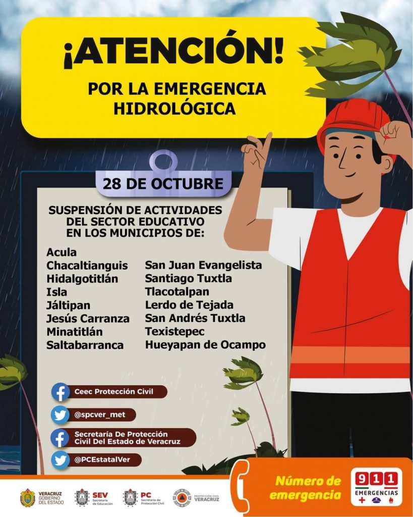 Derivado de la emergencia hidrológica en el sur del Estado de Veracruz, se suspenden clases mañana lunes 28 de octubre en los siguientes municipios.⛈️☔