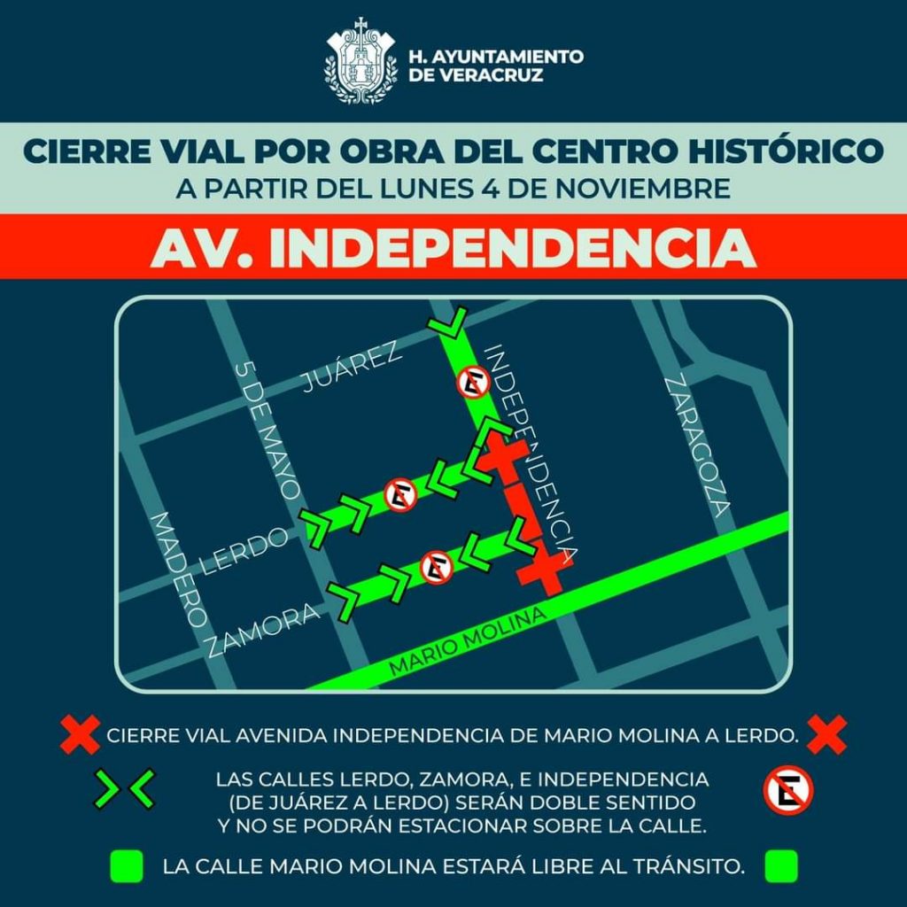 Veracruz, Ver., 4 de noviembre de 2024.- El Ayuntamiento de Veracruz Ciudad y Puerto informa a la ciudadanía que, debido a las obras en el Centro Histórico de la ciudad habrá cierre vial en la avenida Independencia, de Mario Molina a Lerdo, a partir de este lunes 04 de noviembre y hasta nuevo aviso.