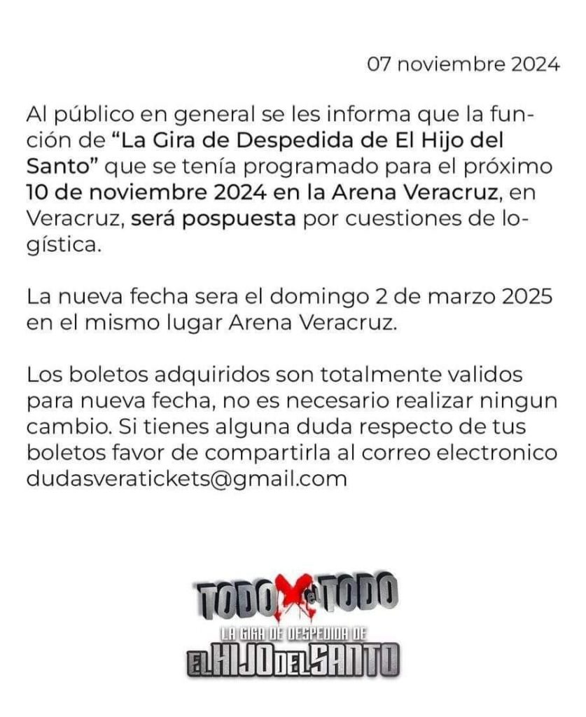 Veracruz, Veracruz, 7 de noviembre 2024.- A través de un comunicado emitido por la producción y la empresa boletera Veratickets, se está informando que la función de lucha libre de El hijo del Santo, programada para este domingo 10 de noviembre se reprograma para el domingo 2 de marzo del 2025.