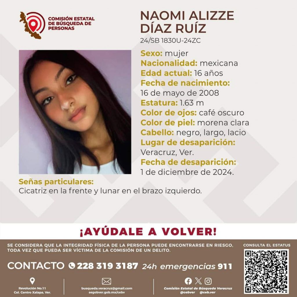 La familia de Naomi Alizze Díaz Ruiz agradecerá cualquier información que ayude a localizarla al teléfono 228 319 31 87 o al 911.