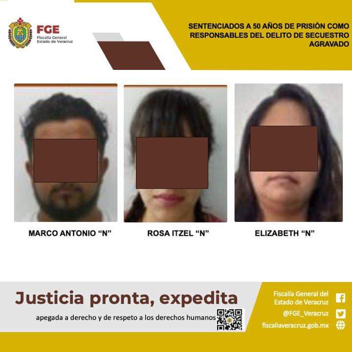 Xalapa, Ver., 2 de diciembre de 2024.-La Fiscalía General del Estado, a través de la Unidad Especializada en Combate al Secuestro, logró sentencia condenatoria de 50 años de prisión en contra de Marco Antonio “N”, Rosa Itzel “N” y Elizabeth “N”, como responsables del delito de secuestro agravado, cometido en agravio de la víctima identificada con las iniciales M.R.T.