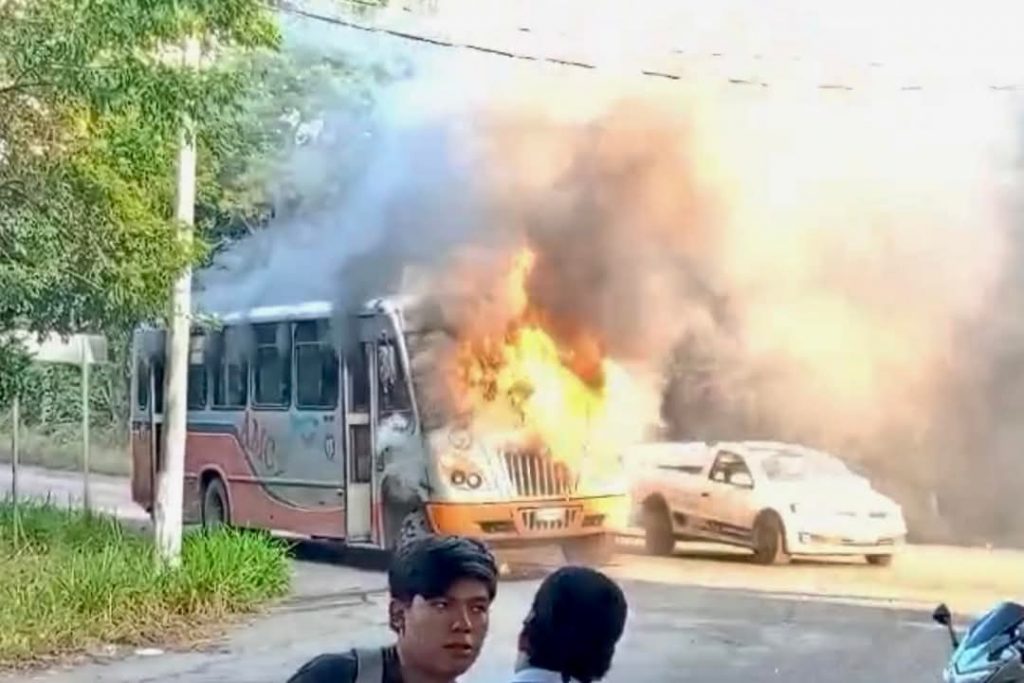 Un camión de pasajeros de la localidad de Purga, municipio de Manlio Fabio, fue consumida en llamas sobre la carretera estatal, a la altura de Cabo Verde, los hechos fueron registrados por cámara de vigilancia y conductores de la zona.