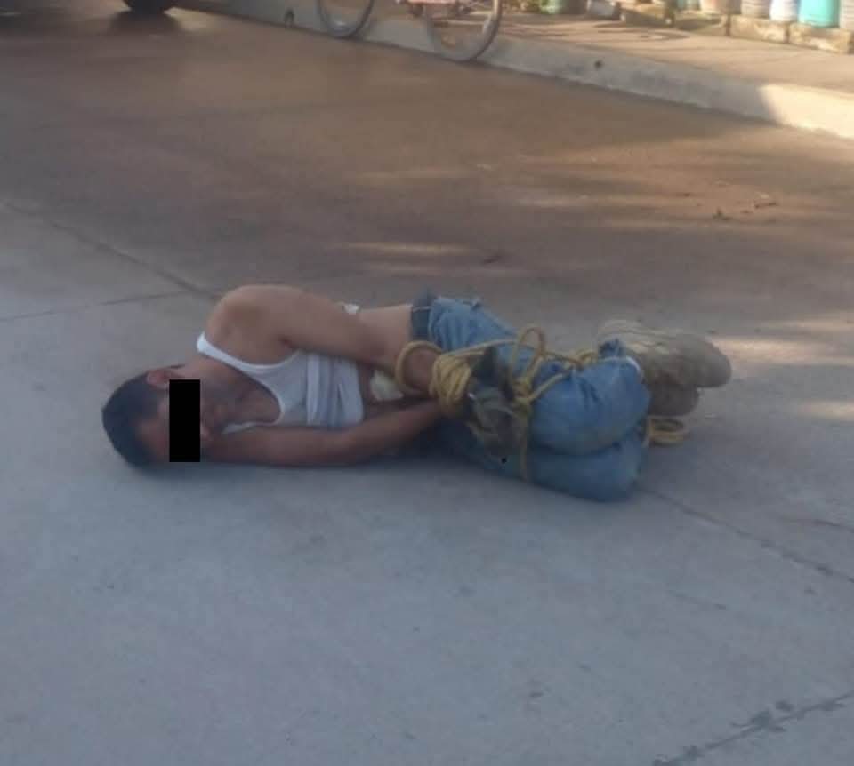 El agresor identificado como José Antonio C.Y. ya tiene antecedentes de ser violento y agredir a sus vecinos, en esta ocasión aventó piedras a una camioneta causando daños en el parabrisas y lámina, para después sacar una navaja e intentar herir a otras vecinos, por lo que fue sometido y amarrado en la calle Morelos casi esquina Francisco Villa.