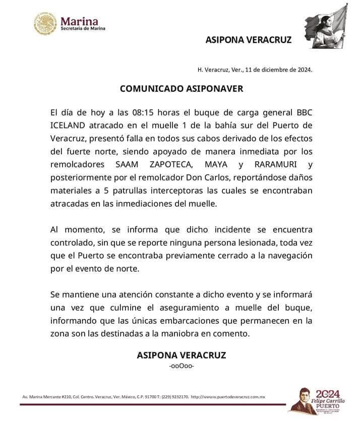 El día de hoy a las 08:15 horas el buque de carga general BBC ICELAND atracado en el muelle 1 de la bahía sur del Puerto de Veracruz, presentó falla en todos sus cabos derivado de los efectos del fuerte norte, siendo apoyado de manera inmediata por los remolcadores SAAM ZAPOTECA, MAYA y RARAMURI у posteriormente por el remolcador Don Carlos, reportándose daños materiales a 5 patrullas interceptoras las cuales se encontraban atracadas en las inmediaciones del muelle.
