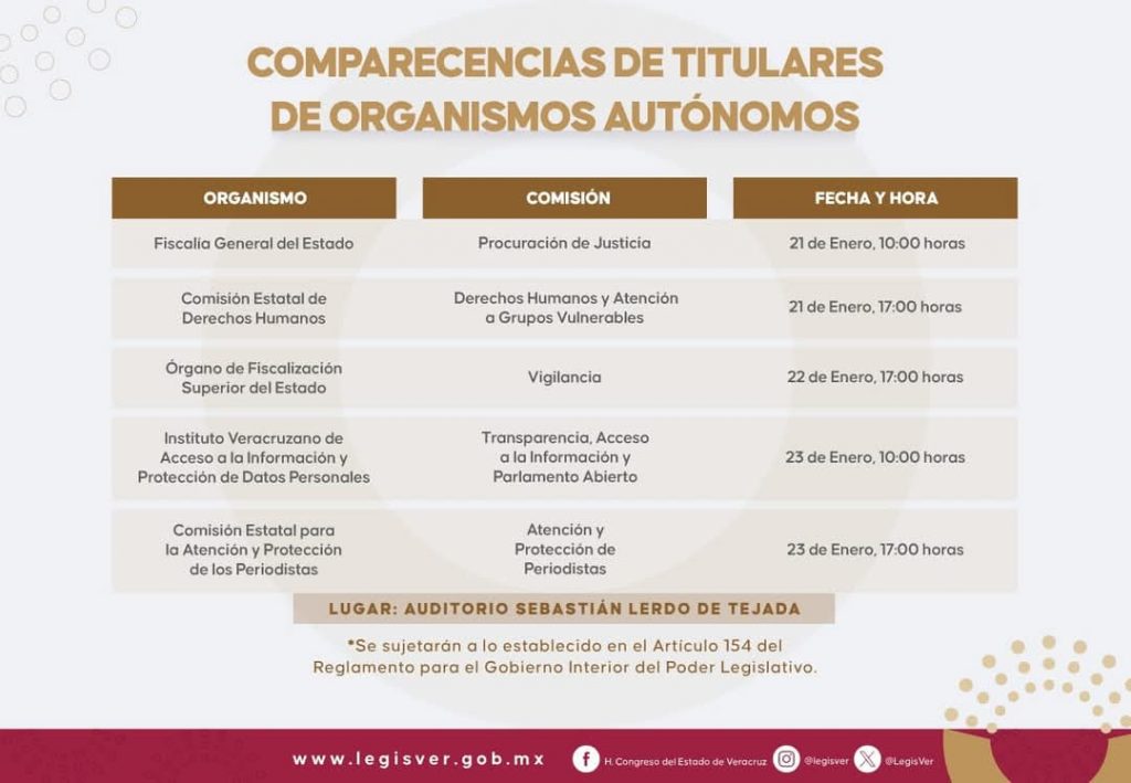 Para el jueves 23 de enero, a las 10:00 horas, el Instituto Veracruzano de Acceso a la Información y Protección de Datos Personales (IVAI) se presentará ante la Comisión Permanente de Transparencia, Acceso a la Información y Parlamento Abierto. Este mismo día, a las 17:00 horas, la Comisión Permanente de Atención y Protección de Periodistas recibirá a la Comisión Estatal para la Atención y Protección de los Periodistas (CEAPP).