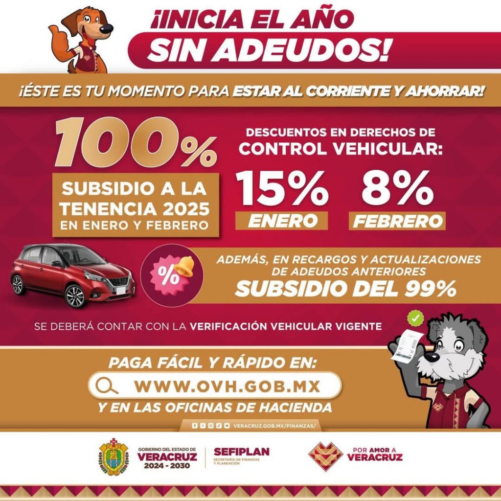 Xalapa, Ver., miércoles 15 de enero de 2025.- La secretaría de Finanzas y Planeación (Sefiplan) recuerda a las y los contribuyentes que el descuento del 15 por ciento en el pago de derechos vehiculares estará vigente hasta el 31 de enero, con un costo de 575 pesos para motocicletas y mil 025 pesos para automóviles, montos que incluyen el impuesto de fomento a la educación y el donativo a la Cruz Roja.