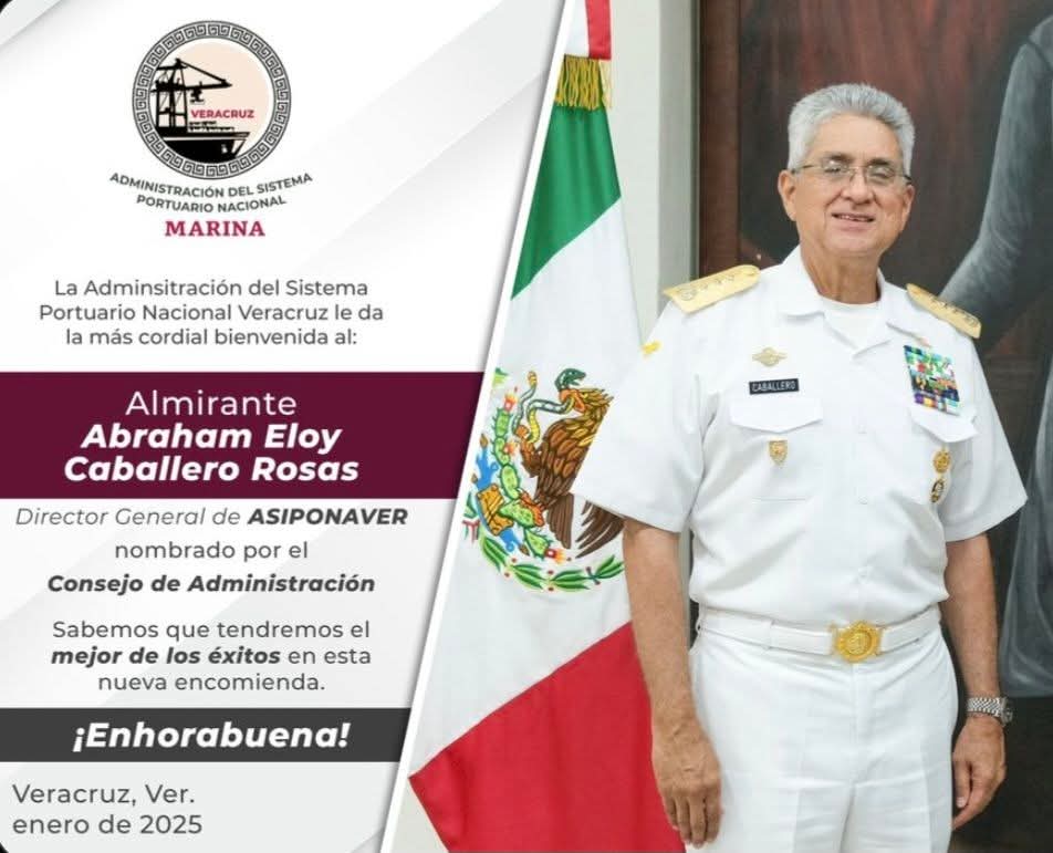 El almirante Abraham Eloy Caballero Rosas fue designado por el consejo de administración como el nuevo director de la Administración del Sistema Portuario Nacional (ASIPONA) en Veracruz, sustituyendo en el cargo al almirante Carlos Velázquez Tiscareño, quien estuvo al frente de la dependencia desde abril de 2024.