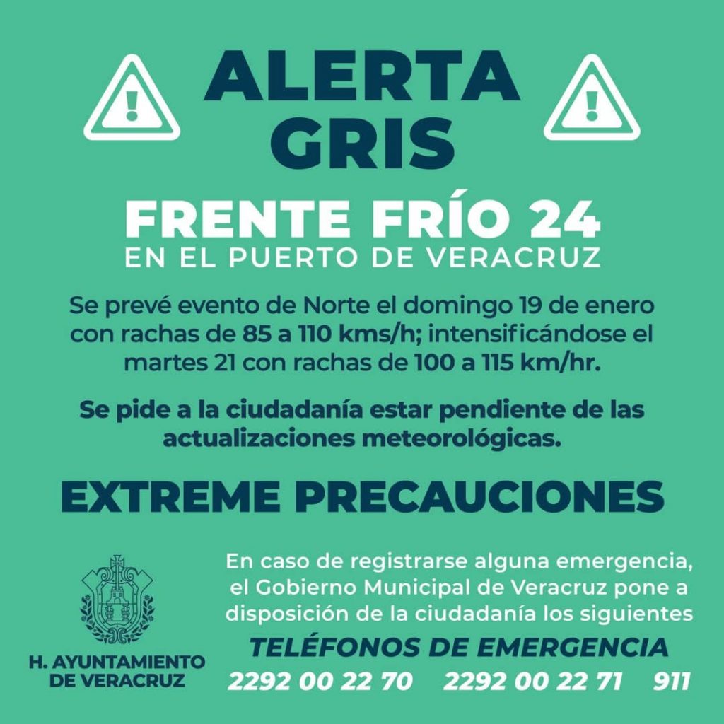 Veracruz, Ver., 17 de enero de 2025.- El gobierno municipal de Veracruz, a través de la Unidad de Protección Civil, informa sobre la activación de la Alerta Gris en el puerto de Veracruz debido al ingreso del Frente Frío no. 24, ocasionado por el desplazamiento de una masa de aire ártico.