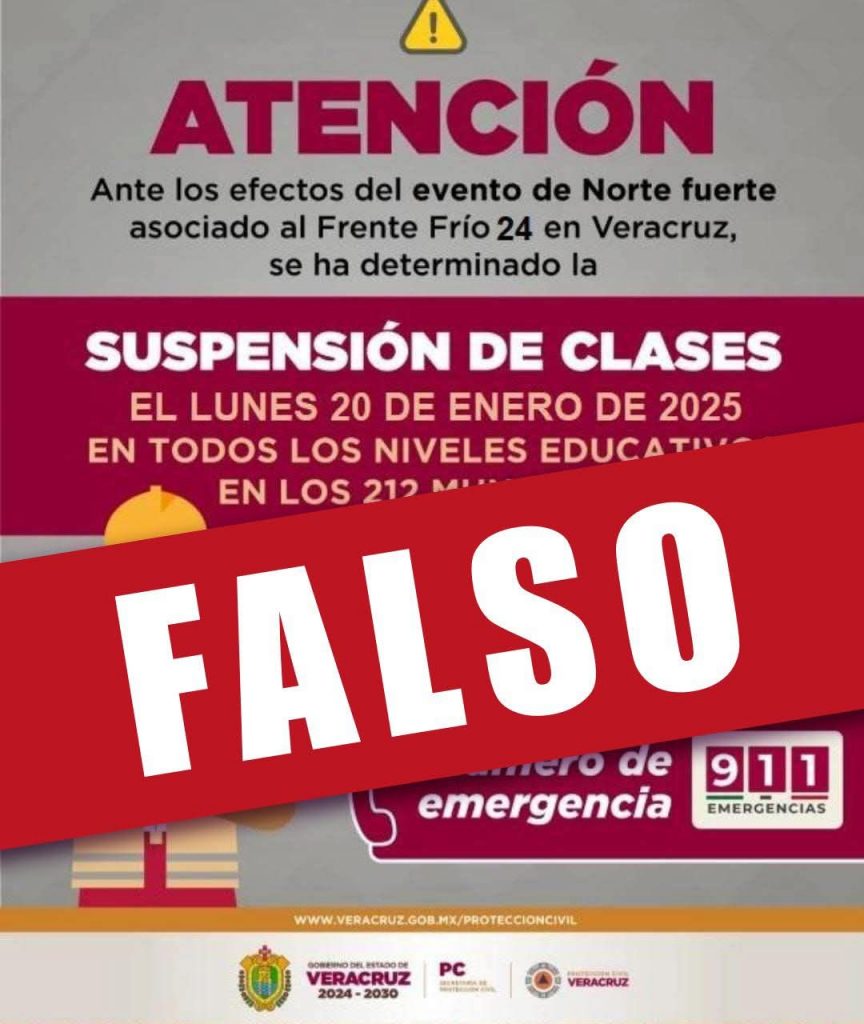 Xalapa, Ver.- El gobierno del Estado a través de las secretarías de Educación y de Protección Civil de Veracruz desmienten que este lunes 20 de enero se vayan a suspender las clases en todos los niveles educativos debido a los efectos del Frente Frío no. 24.