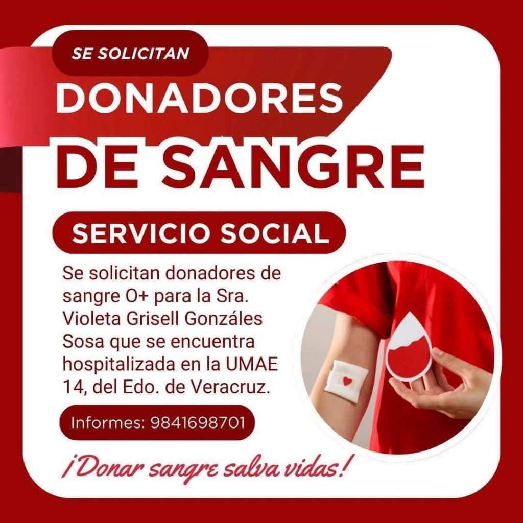 En lo que parece ser una carrera contra reloj, solicitan 33 donadores de sangre O+ para la ciudadana Violeta Grisel González Sosa, quien se encuentra internada y delicada de salud en las instalaciones de Unidad Médica del Alta Especialidad (UMAE) número 14 del Instituto Mexicano del Seguro Social (IMSS) con sede en la avenida Cuauhtémoc del puerto de Veracruz.