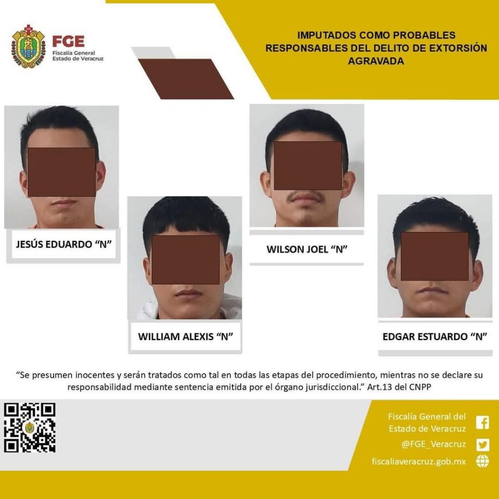 Tuxpan, Ver., 22 de enero de 2025.-La Fiscalía General del Estado, a través de la Fiscalía Regional Tuxpan, realizó imputación en contra de Jesús Eduardo “N”, William Alexis “N”, Wilson Joel “N”, y Edgar Estuardo “N”, como probables responsables del delito de extorsión agravada, cometido en agravio de una panadería Dauzon.