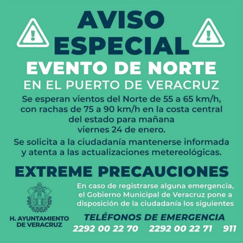 Veracruz, Ver., 23 de enero de 2025.– El gobierno municipal de Veracruz, a través de la Unidad de Protección Civil, informa sobre el aviso especial ante el evento de norte previsto para mañana viernes 24 de enero en el puerto de Veracruz.