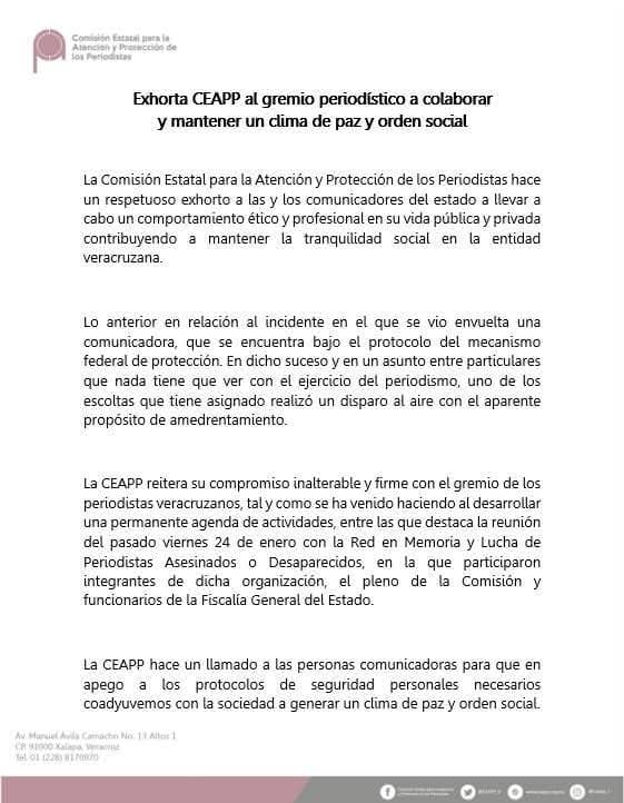 La Comisión Estatal para la Atención y Protección de los Periodistas hace un respetuoso exhorto a las y los comunicadores del estado a llevar a cabo un comportamiento ético y profesional en su vida pública y privada contribuyendo a mantener la tranquilidad social en la entidad veracruzana.