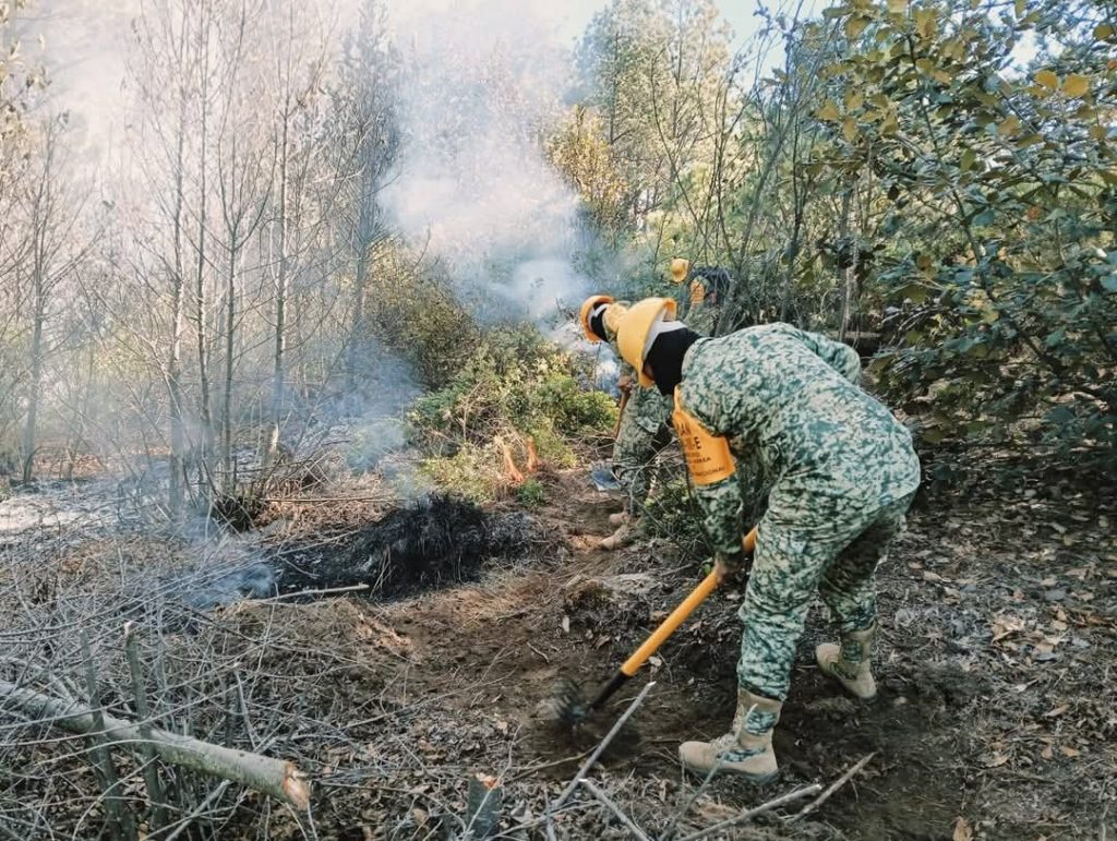 Elementos del 111/o. Batallón de Infantería, se desplegaron en el punto, en coordinación con personal de CONAFOR y Protección Civil, en labores de apertura de brechas contrafuego para sofocar el incendio, no se reportaron personas lesionadas, consumiendose aprox. 1 Has. de bosque bajo, hojarasca y pastizal.