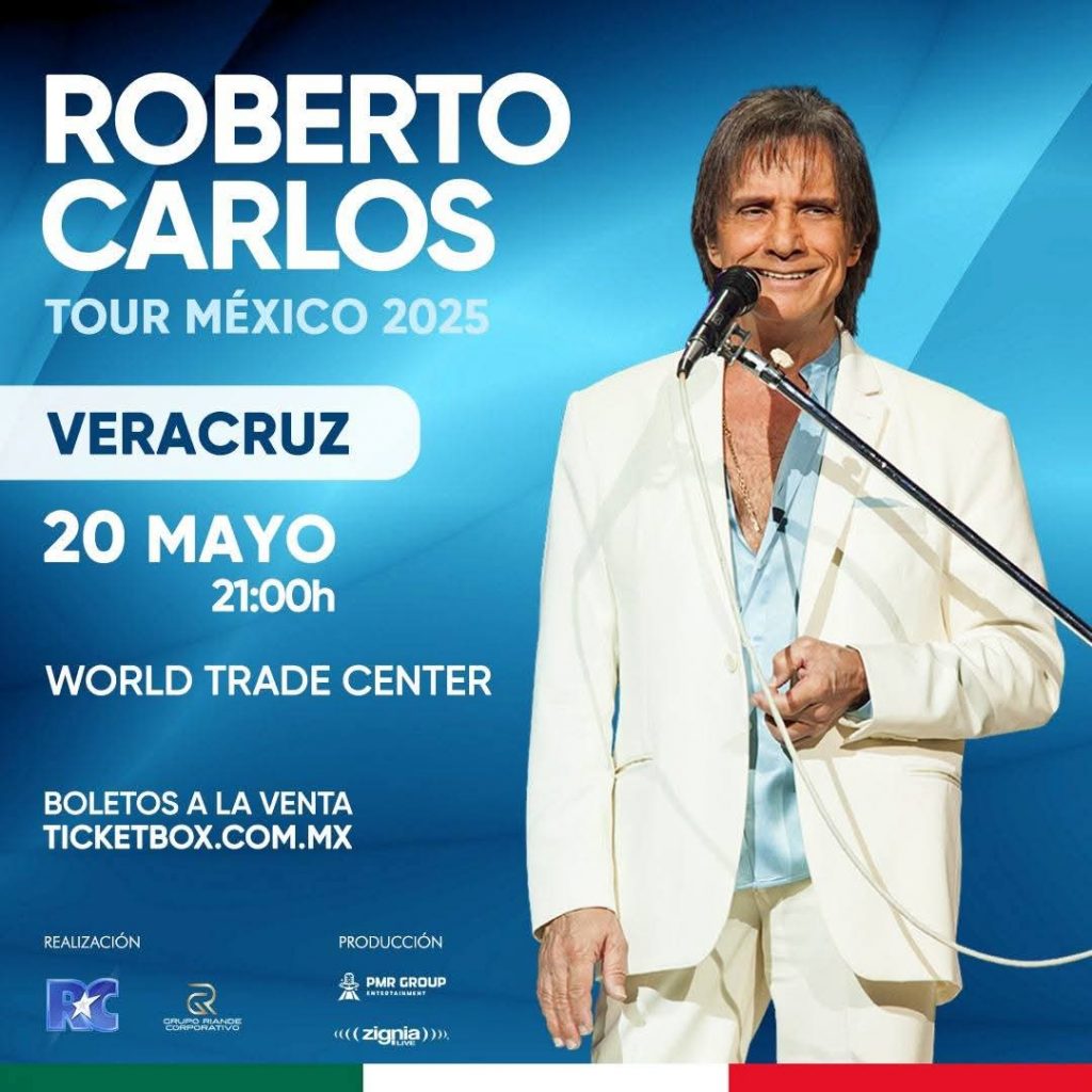 El tour 2025 de Roberto Carlos se presentará en tierras veracruzanas el martes de 20 mayo a partir de las 21:00 horas en el WTC Boca del Río.