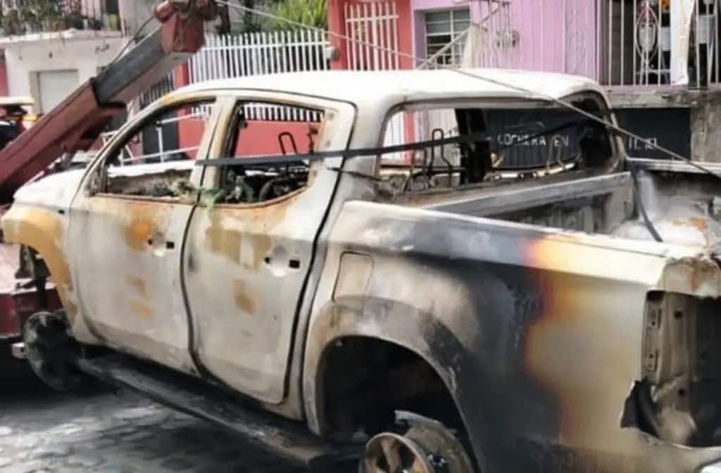 Los agresores también incendiaron la camioneta oficial en la que se transportaban los agentes, una Mitsubishi L200 blanca con logotipos de la FGR, la cual quedó completamente calcinada.