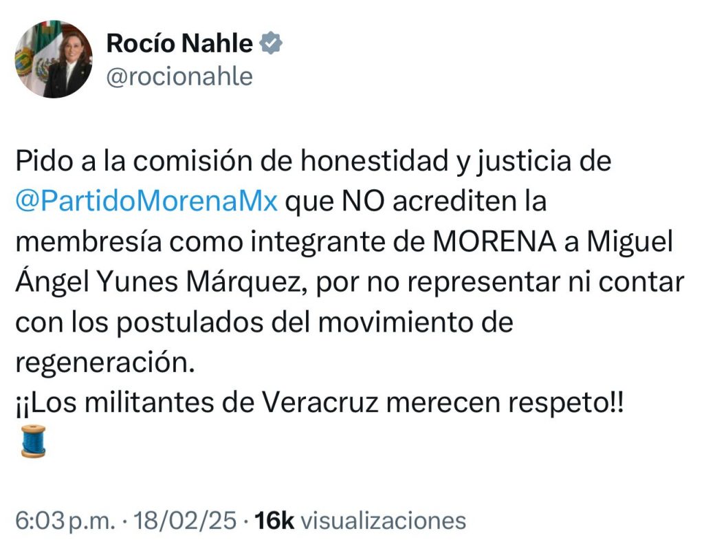 A través de sus redes sociales, la mandataria estatal hizo un llamado a la Comisión Nacional de Honestidad y Justicia para que no se acredite la membresía a Yunes Márquez.