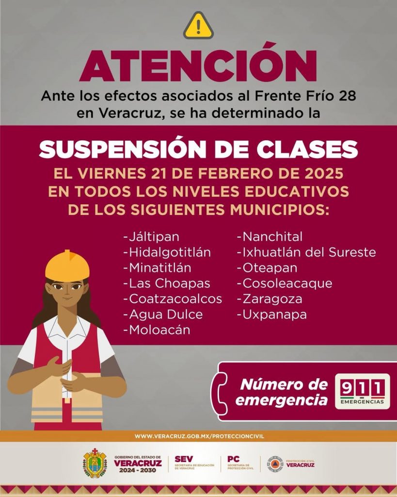 Xalapa, Ver., jueves 20 de febrero de 2025.- Por las lluvias derivadas del Frente Frío 28 y su masa ártica en Veracruz, el gobierno del Estado suspende clases en todos los niveles educativos de 13 municipios del sur: Agua Dulce, Coatzacoalcos, Cosoleacaque, Hidalgotitlán, Ixhuatlán del Sureste, Jáltipan, Las Choapas, Minatitlán, Moloacán, Nanchital, Oteapan, Uxpanapa y Zaragoza.
