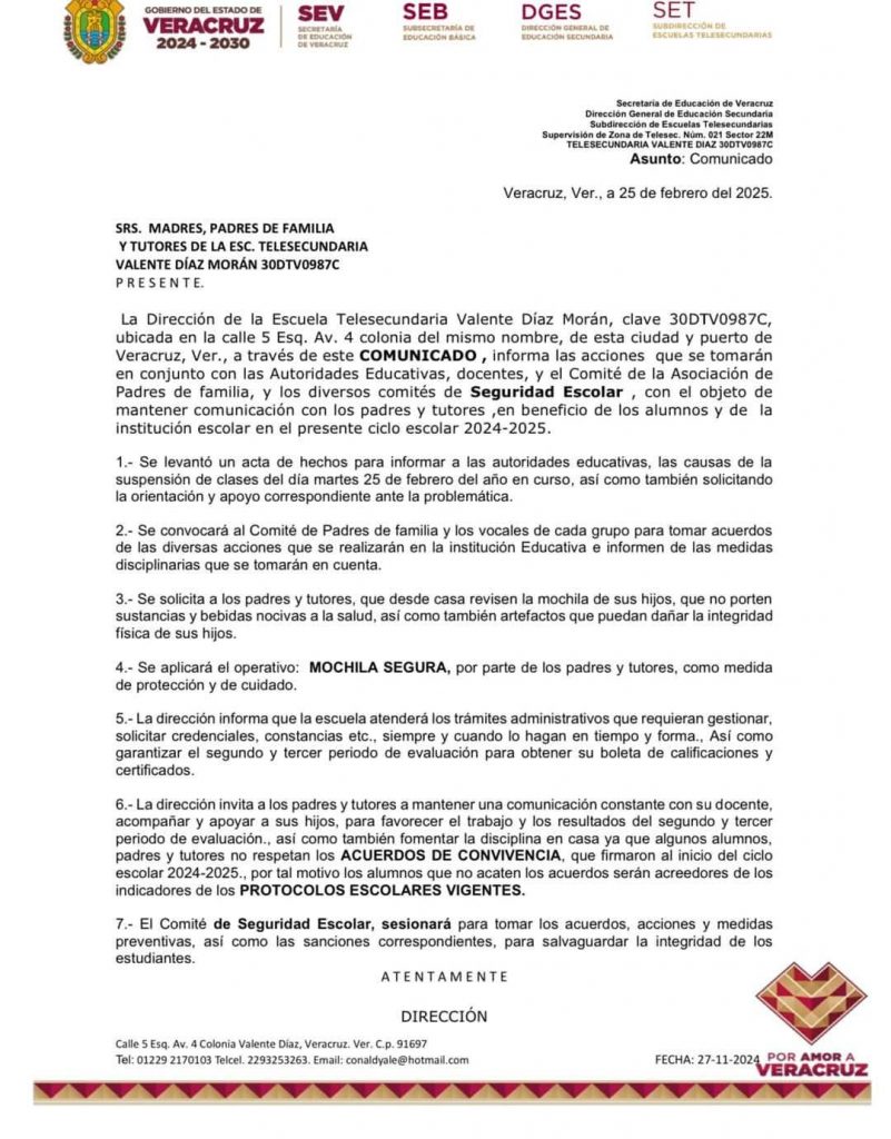 A través de un comunicado, directivos de la telesecundaria Valente Díaz confirmaron que este miércoles 26 de febrero tampoco habrá clases presenciales.