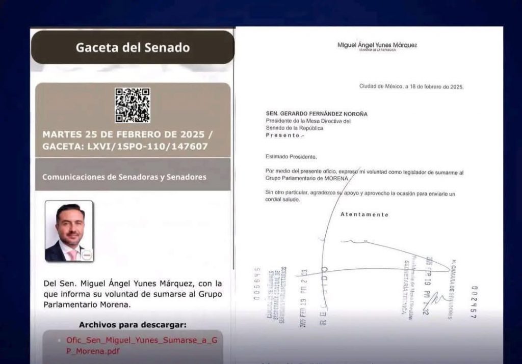 El senador Miguel Ángel Yunes Márquez formalizó su integración al Grupo Parlamentario de Morena, según se publica hoy en la Gaceta Legislativa.