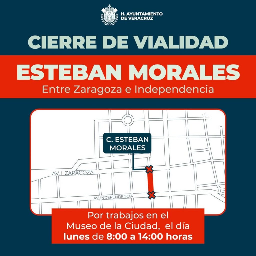 Veracruz, Ver., 2 de marzo de 2025.- El Ayuntamiento de Veracruz informa que, debido a obras en el Museo de la Ciudad, el día lunes 3 de marzo, habrá un cierre vial en la calle Esteban Morales, entre las avenidas Zaragoza e Independencia, en el Centro Histórico.