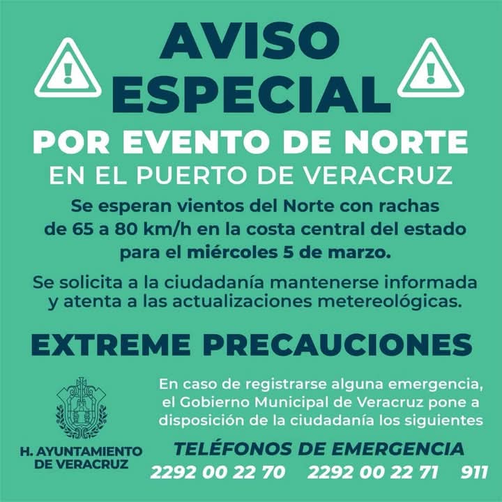 Veracruz, Ver., 3 de marzo de 2025.- El gobierno municipal de Veracruz, a través de la Unidad de Protección Civil, informa sobre el aviso especial ante el evento de norte previsto para el miércoles 5 de marzo en el puerto de Veracruz.