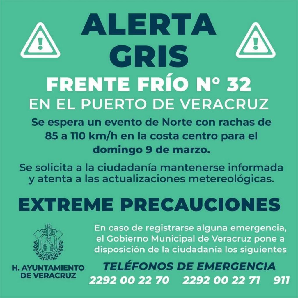 Por llegada de frente frio No. 32, se pronostica norte con rachas de 85 a 110 km/h el domingo 9 de marzo en la costa centro. En caso de alguna emergencia, pueden comunicarse a los siguientes teléfonos: 2292002270, 2292002271 y el 911.