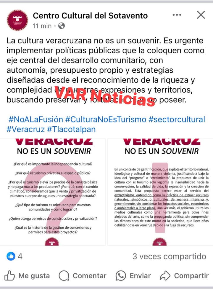 La página oficial de Facebook del centro cultural sotavento, con sede en Tlacotalpan #veracruz, apareció una postura en contra de la fusión entre la secretaría de turismo, con la de cultura, misma que estuvo es puesta cerca de diez minutos y después borrada.