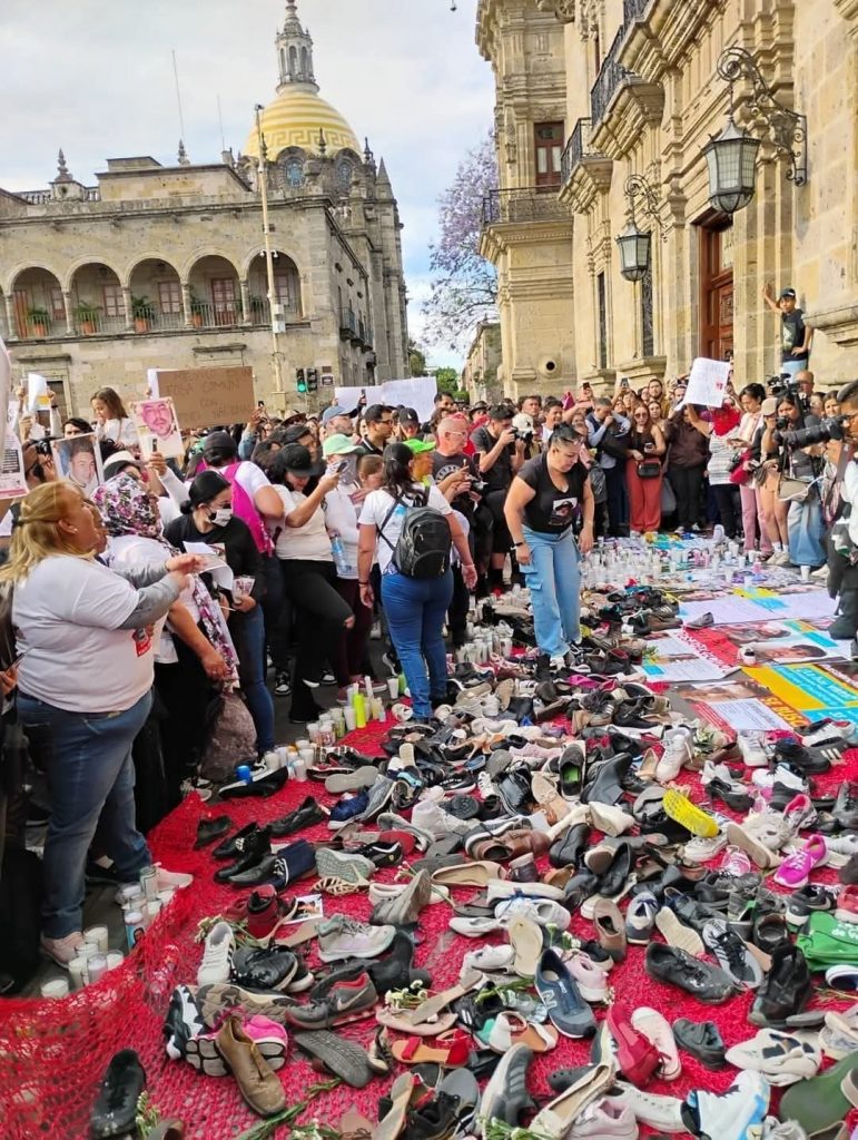 La tarde de este sábado 15 de marzo cientos de personas se manifestaron a las afueras de Palacio de Gobierno en Jalisco, colocando zapatos en protesta de lo ocurrido en el rancho de Teuchitlán.