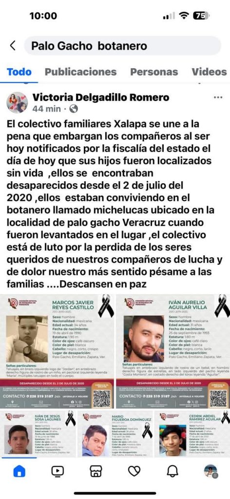 “El colectivo Familiares Xalapa se une a la pena que embargan a los compañeros al ser hoy notificados por la Fiscalía del Estado el día de hoy que sus hijos fueron localizados sin vida, ellos se encontraban desaparecidos desde el 2 de julio del 2020, estaban conviviendo en el botanero llamado Michelucas ubicado en la localidad de Palo Guacho, Veracruz cuando fueron levantados en el lugar, el colectivo está de luto por la perdida de los seres queridos de nuestros compañeros de lucha y de dolor nuestro más sentido pésame a las familias ….Descansen en paz”, escribió a través de sus redes sociales.