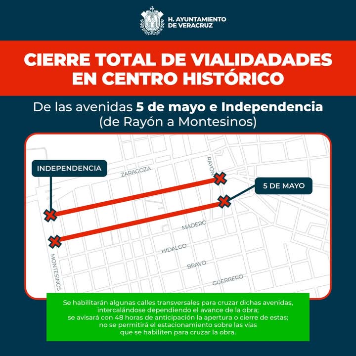 Veracruz, Ver., 27 de marzo de 2025.- El Ayuntamiento de Veracruz informa a la ciudadanía que, debido a las obras de pavimentación en concreto hidráulico de las avenidas Independencia y 5 de Mayo, de las calles Rayón a Montesinos, en el Centro Histórico de la ciudad, habrá cierre vial a partir de las primeras semanas del mes abril.