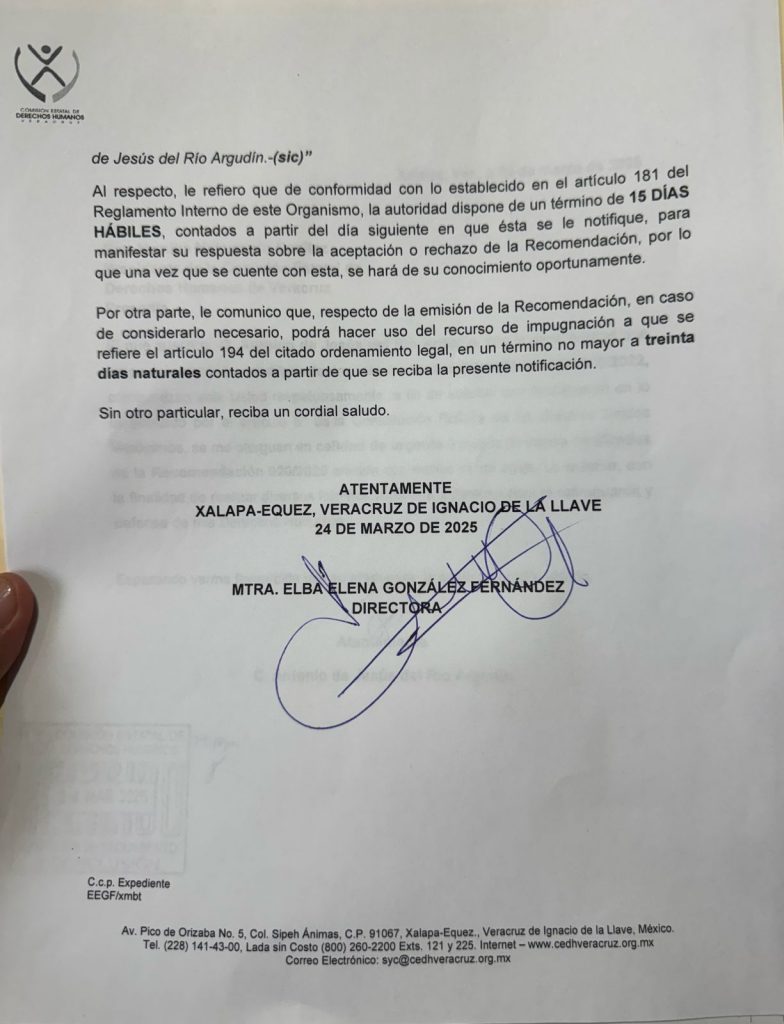 Asimismo, agradeció al diputado local Héctor Yunes Landa, secretario de la Comisión de Derechos Humanos del Congreso, por dar seguimiento puntual al caso y vigilar que la recomendación sea cumplida por el gobierno estatal.