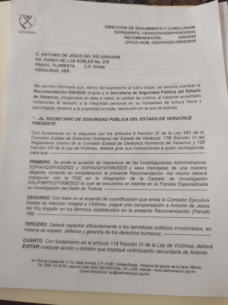 Veracruz, Ver.— El político y empresario Antonio del Río Argudín alzó la voz para exigir justicia tras la notificación de la Recomendación 020/2025 emitida por la Comisión Estatal de Derechos Humanos (CEDH), en la que se acredita que fue víctima de tortura durante su detención en 2022, bajo el gobierno del exgobernador Cuitláhuac García Jiménez.