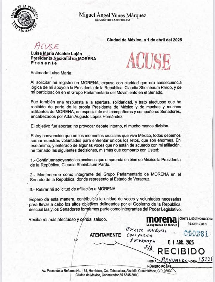 El día de hoy, el senador por Veracruz, Miguel Ángel Yunes Márquez presentó el siguiente oficio dirigido a la presidenta nacional de Morena: