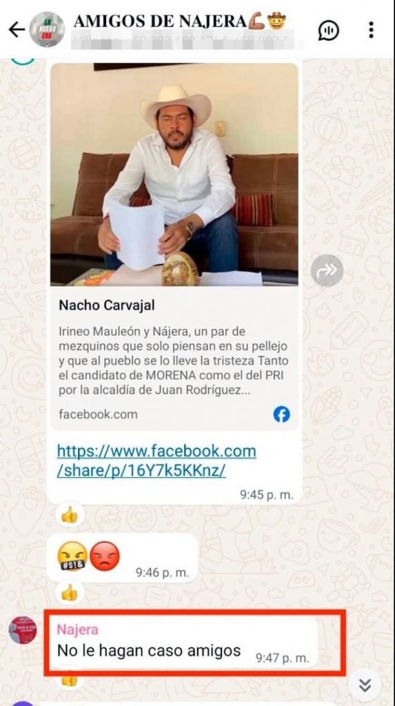 Más grave aún, en el mismo grupo de mensajería al que hace referencia Carvajal, uno de los seguidores del candidato llegó a sugerir que “le mochen la lengua y lo metan a la cárcel”, sin que Nájera interviniera o reprobara la amenaza. “No lo llamas a la cordura, no te muestras como el líder que deberías ser”, reclamó el periodista, añadiendo que, al día siguiente, el propio candidato presentó una denuncia formal en su contra ante la Fiscalía en Isla.