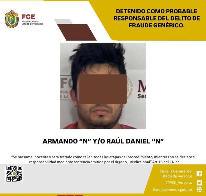 Veracruz, Ver., a 27 de mayo 2025.-La Fiscalía General del Estado informa que, elementos de la policía ministerial de Veracruz y Tabasco, en colaboración, cumplimentaron una orden de aprehensión en el municipio de Medellín de Bravo, en contra de Armando “N” y/o Raúl Daniel “N” como probable responsable del delito de fraude genérico, cometido en agravio de las víctimas identificadas con las iniciales I.G.M.T., K.P.C., A.H.C., J.A.A.J., y A.M.G.