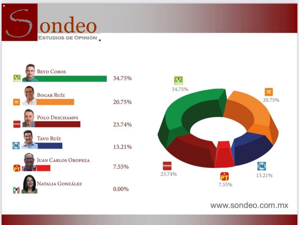 El segundo lugar se lo disputan el candidato de Morena, Polo Deschamps, con el 23.7 por ciento de intención de voto y el abanderado de Movimiento Ciudadano, Bogar Ruiz, quien obtuvo el 20.7