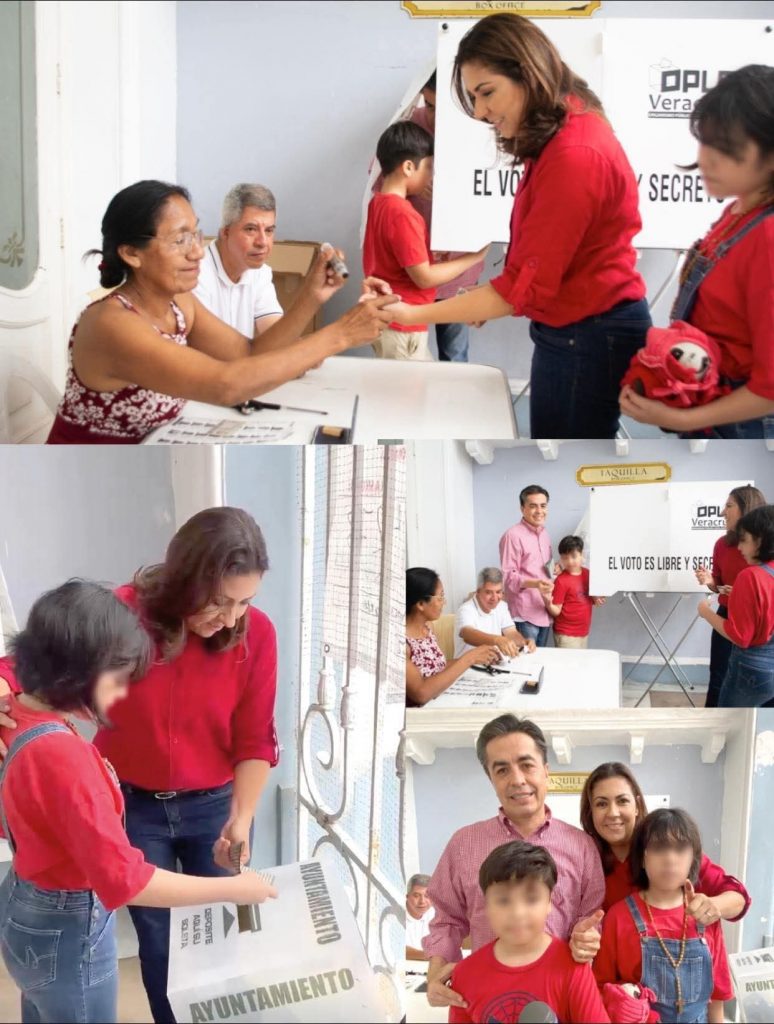 Carolina Gudiño Corro acudió a votar acompañada de su esposo Victor Hugo Vázquez Bretón y sus hijos en la casilla que le corresponde ubicada en el teatro Francisco Javier Clavijero