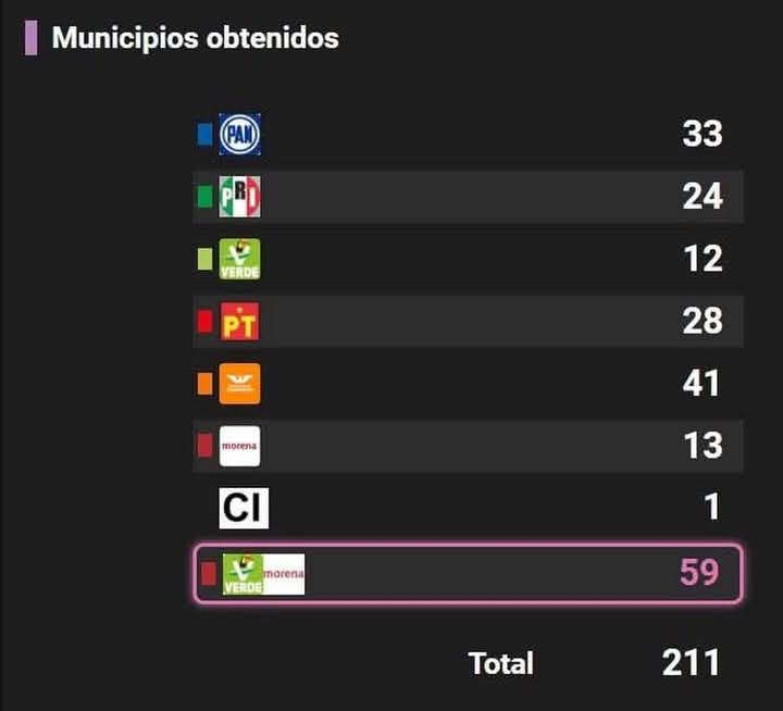 Al momento lleva registrados 507 mil 304 votos, con un porcentaje de aceptación del 19.17 por ciento, logrando así 41 alcaldías; aunque, al menos en cinco municipios más mantiene una contienda cerrada, por lo cual se podría incrementar en próximas horas el número de Ayuntamientos que encabece.