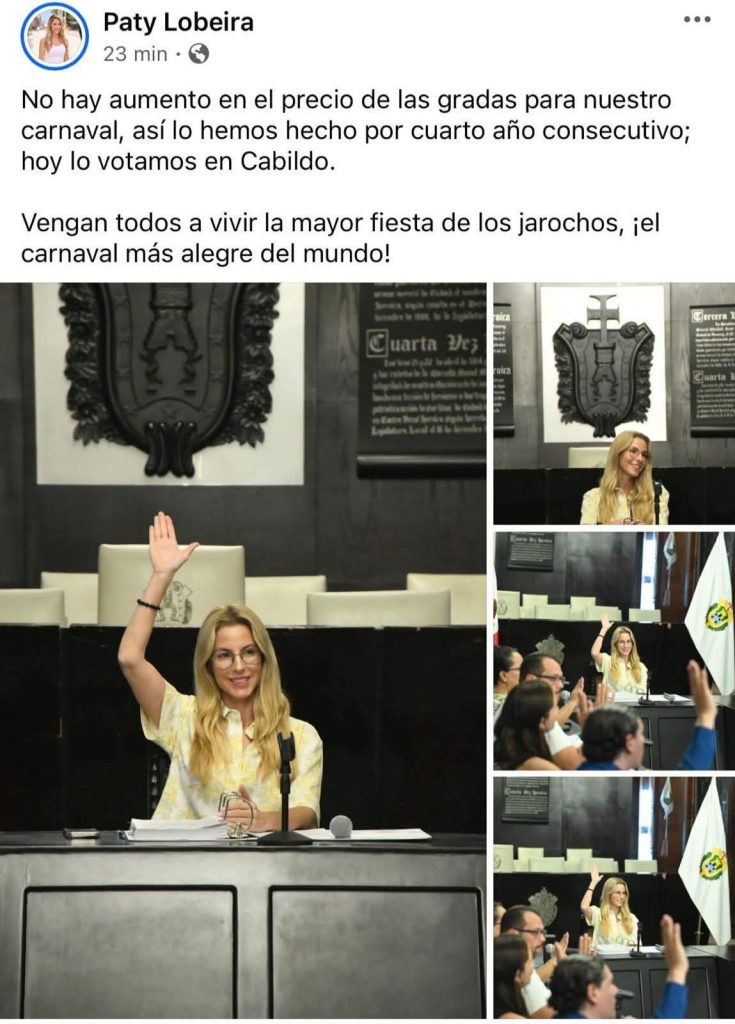 Anuncia Paty Lobeira que no hay aumento en el costo de las gradas para el carnaval de Veracruz 2025, así se aprobó en sesión de cabildo por cuarto año consecutivo.