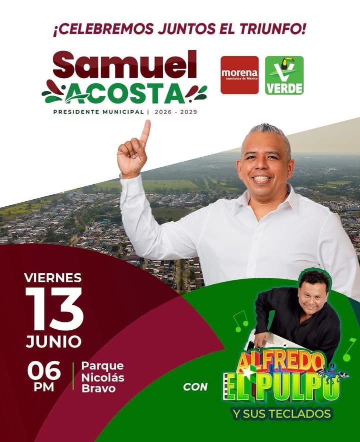 El ambiente festivo se apoderará del municipio de Medellín de Bravo este viernes 13 de junio, cuando el alcalde electo Samuel Acosta celebre su triunfo en las urnas acompañado de pueblo, música y alegría. La cita es a partir de las 6:00 de la tarde en el parque Nicolás Bravo, donde los asistentes podrán disfrutar de un espectacular concierto de Alfredo “El Pulpo” y sus Teclados, ¡totalmente gratis!