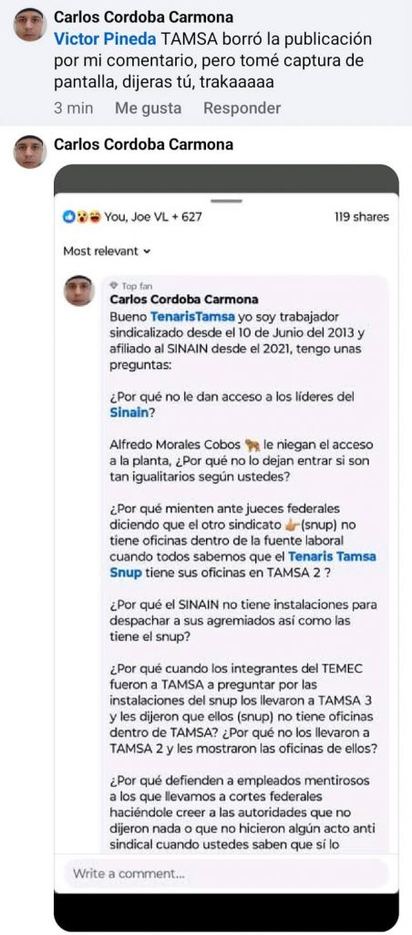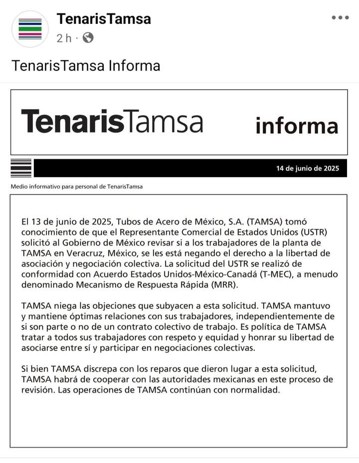 Y es que, la tarde de este sábado TenarisTamsa de #Veracruz, emitió una postura en sus redes sociales, luego que el gobierno de Estados Unidos solicitó a México una investigación bajo el mecanismo laboral de respuesta rápida (MLRR) del T-MEC en contra de la empresa Tubos de Acero de México (TAMSA), ubicada en Veracruz, debido a la denegación de derechos a la libertad de asociación y a la negociación colectiva.