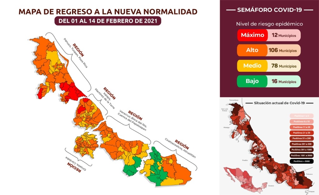 El titular de la Secretaría de Salud de Veracruz, Roberto Ramos Alor, informó que 12 municipios se ubicarán en semáforo rojo del 1 al 14 de febrero de 2021, lo que significa que en esos municipios hay riesgo máximo de adquirir Covid-19. 106 municipios se ubicarán en semáforo naranja que significa riesgo alto, 78 estarán en color amarillo o riesgo medio y 16 estarán en verde o riesgo bajo.