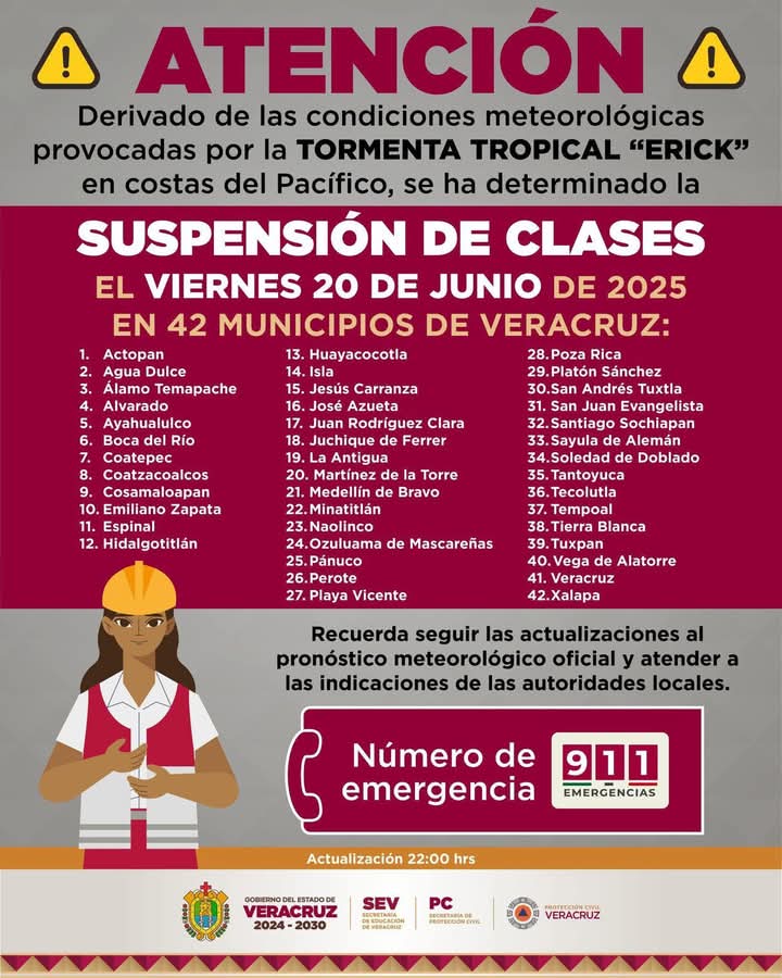 Derivado de las condiciones meteorológicas provocadas por la Tormenta Tropical Erick, este viernes 20 de junio se suspenden clases y labores escolares en 42 municipios del estado de Veracruz.