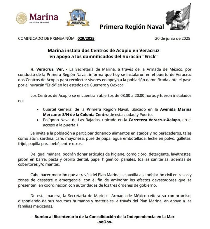 H. Veracruz, Ver. – La Secretaría de Marina, a través de la Armada de México, por conducto de la Primera Región Naval, informa que hoy se instalaron en el puerto de Veracruz dos Centros de Acopio para recolectar víveres en apoyo a la población damnificada ante el paso por el huracán “Erick” en los estados de Guerrero y Oaxaca.
