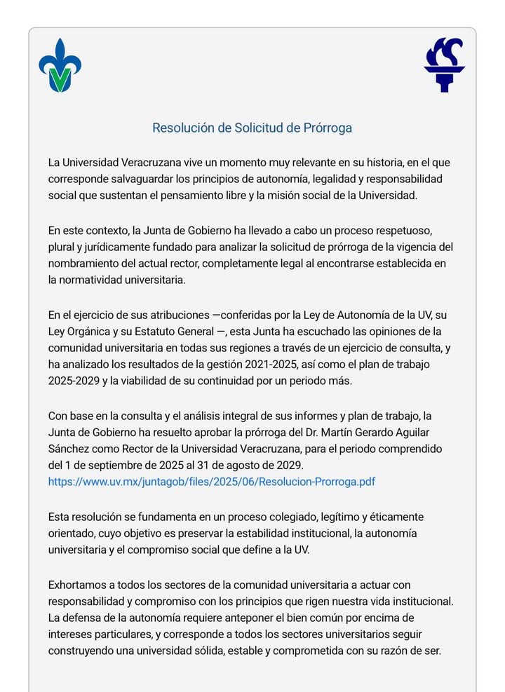 Comunicado de la Junta de Gobierno de la Universidad Veracruzana sobre la prórroga otorgada a Martin Aguilar Sánchez